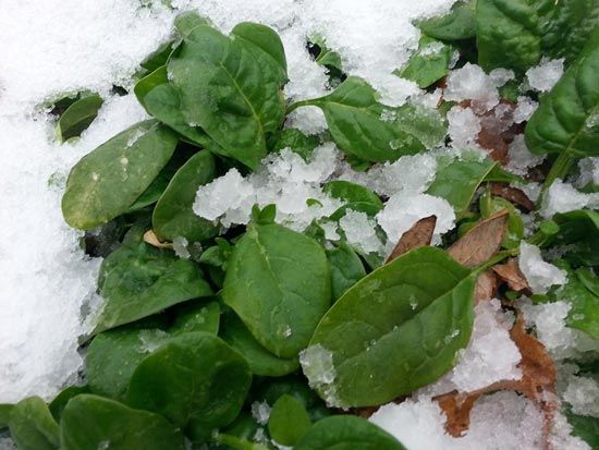 Spinach is a surprisingly tough plant. It overwinters easily in at least zone 6 without protection, growing slowly through winter and bouncing back in early spring. It can even be a perennial in Canada. The leaves will die back in the cold but new shoots will emerge in spring. You’ll want to protect it though if you’re looking to have salad greens in December. You can use a cold frame or a weighted fabric row cover.