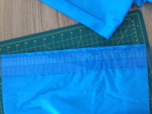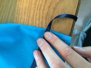 Step 7: Find the centre of the ribbon and place it about 1-2″ down the long edge of your bag, from the top. Stitch it on.
