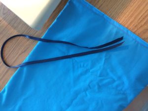 Fold your ribbon in half. Open one long edge of your bag. Place the folded end of the ribbon about 2-3” down from the top of the bag. Leave about 1/4″ hanging out and the ends of the ribbon placed inside your bag. Fold back up the fabric. Sew the seam together.